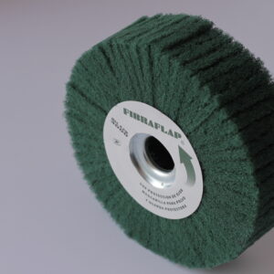 Rueda fibraflap verde para rebabeo y pulido de acero y otros metales. Especializada para el satinado en la industria farmacéutica.